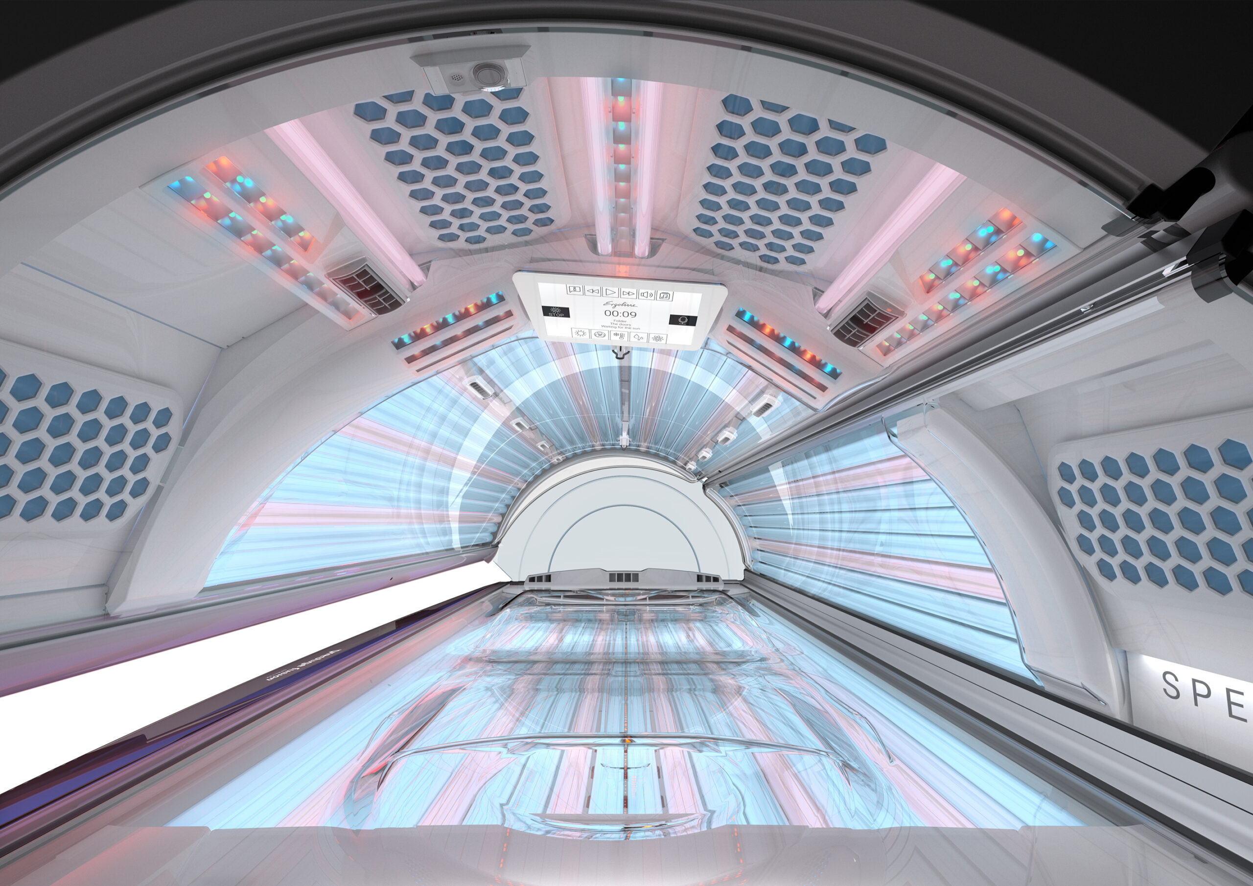 Its cutting-edge Fusion Light Technology blends blue Activating Light LEDs with red Beauty Light LEDs. Blue LEDs prepare the skin for tanning and boost immediate results, while red LEDs care for the skin and stimulate oxygen production—enhancing both the health and intensity of your tan.