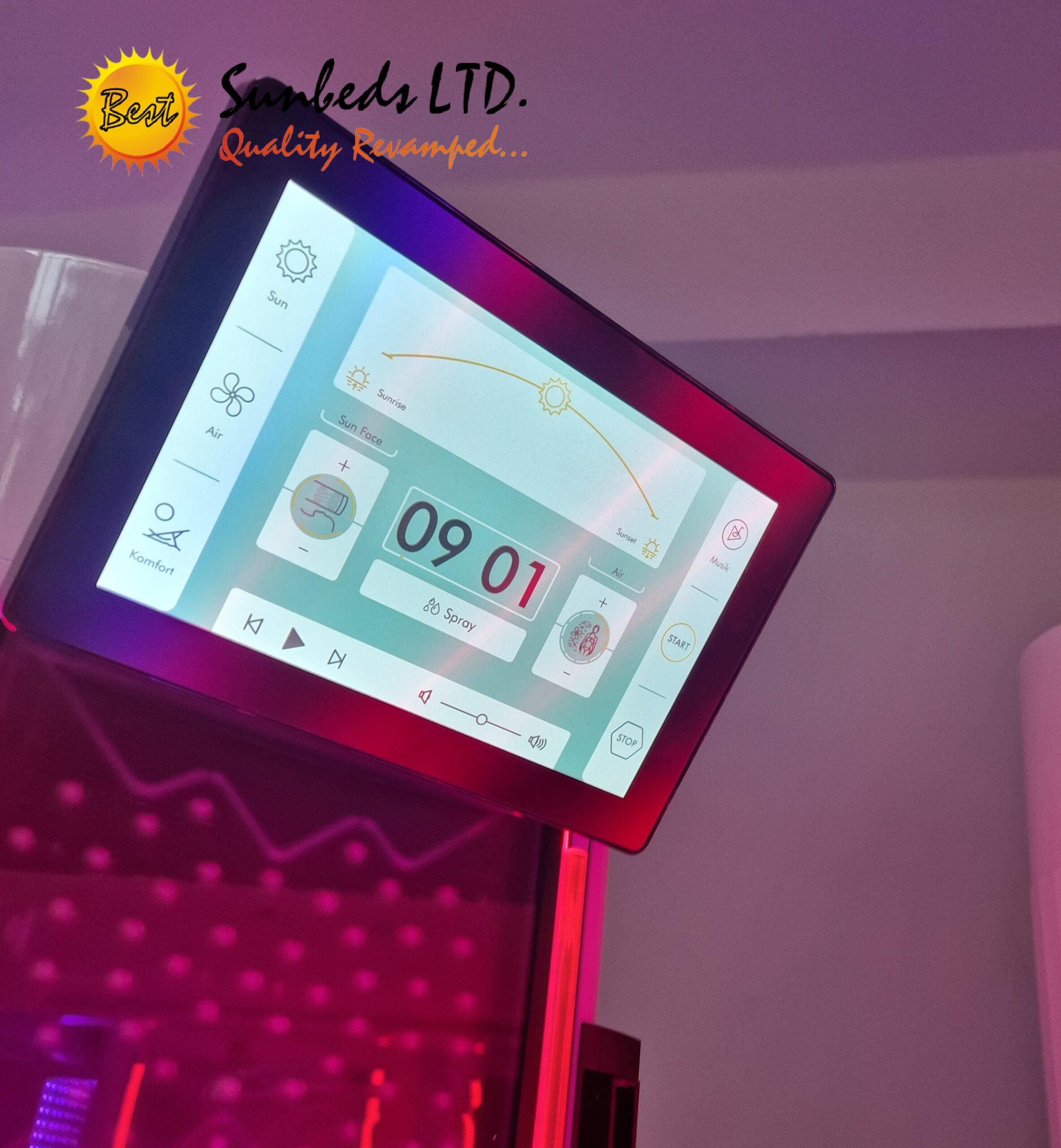 - 10″ SmartControl Video Player – Featuring an intuitive touch display, this advanced control system allows you to easily adjust settings, giving you full control over your tanning session with ease.