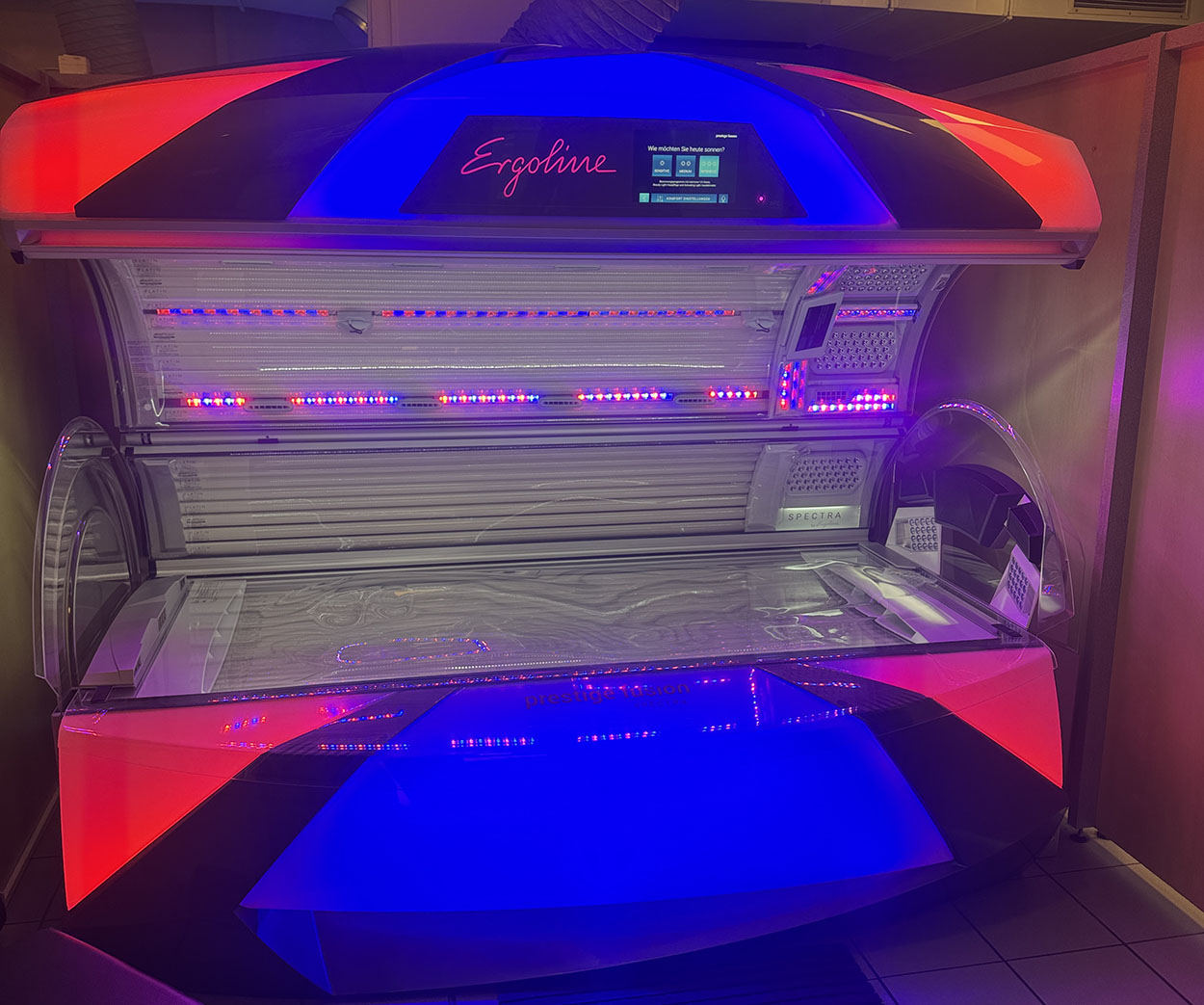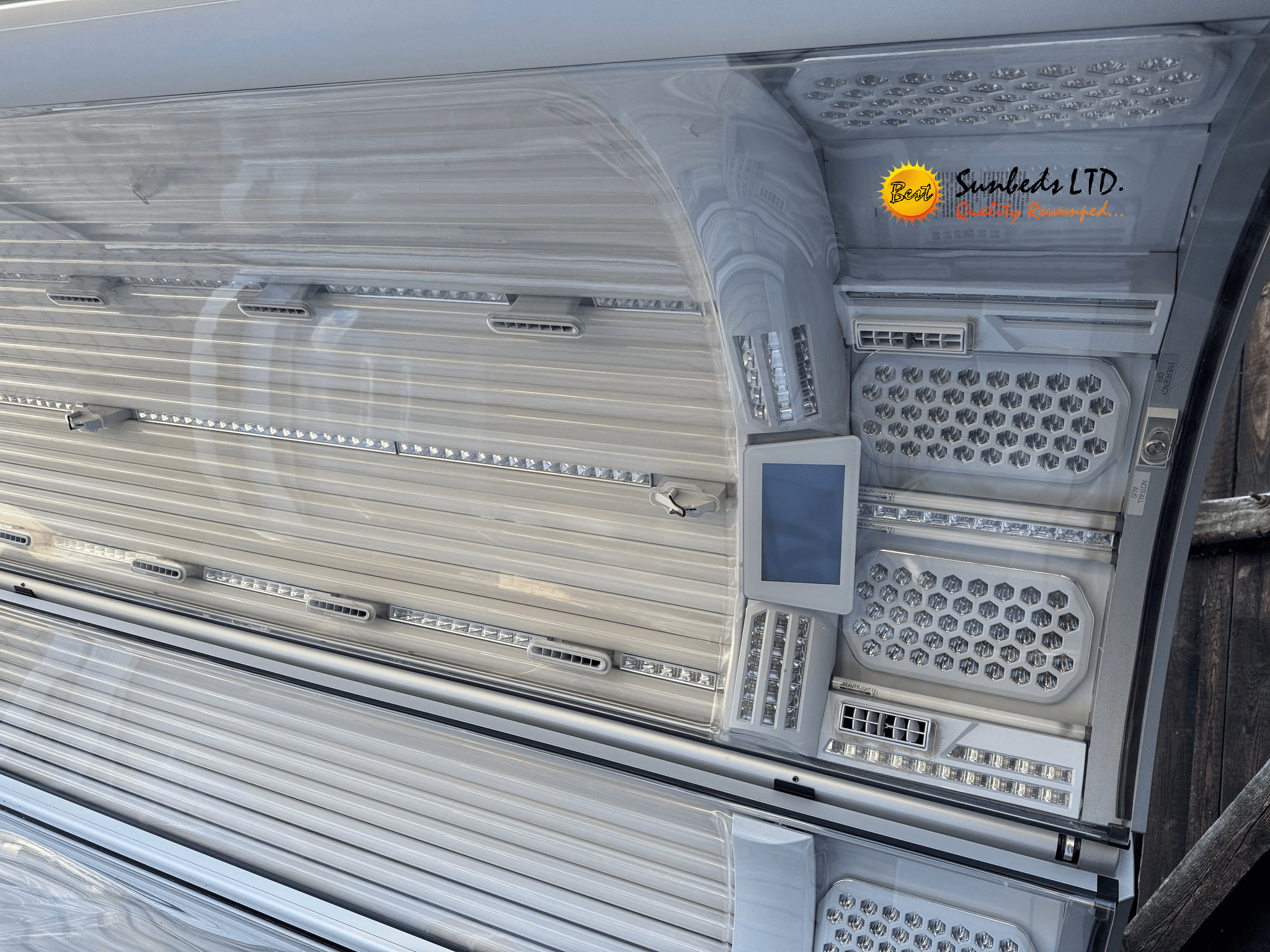 The Ergoline Prestige Fusion Spectra features advanced UVA LEDs in the face and shoulder areas, providing instantly visible tanning results. UVB spaghetti lamps help create a long-lasting tan.