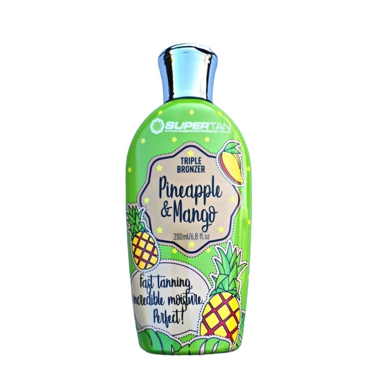 SuperTan Pineapple & Mango Triple Bronzer is your ultimate tanning solution for a flawless, deep tan in no time! This powerful formula blends DHA, walnut shell extract, beta-carotene, erythrulose, tyrosine, and copper for an instant bronzed glow that deepens beautifully. Infused with aloe vera for hydration, plus vitamin E and caffeine to protect and rejuvenate, it leaves your skin soft, smooth, and revitalized. Perfect for tanning beds or sun exposure, it ensures a long-lasting, even tan while preventing dryness. Experience the perfect blend of skincare and tanning for a radiant, hydrated glow!
